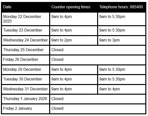 The Income Tax Division telephone lines and public counters are open over the Christmas period at the following times: